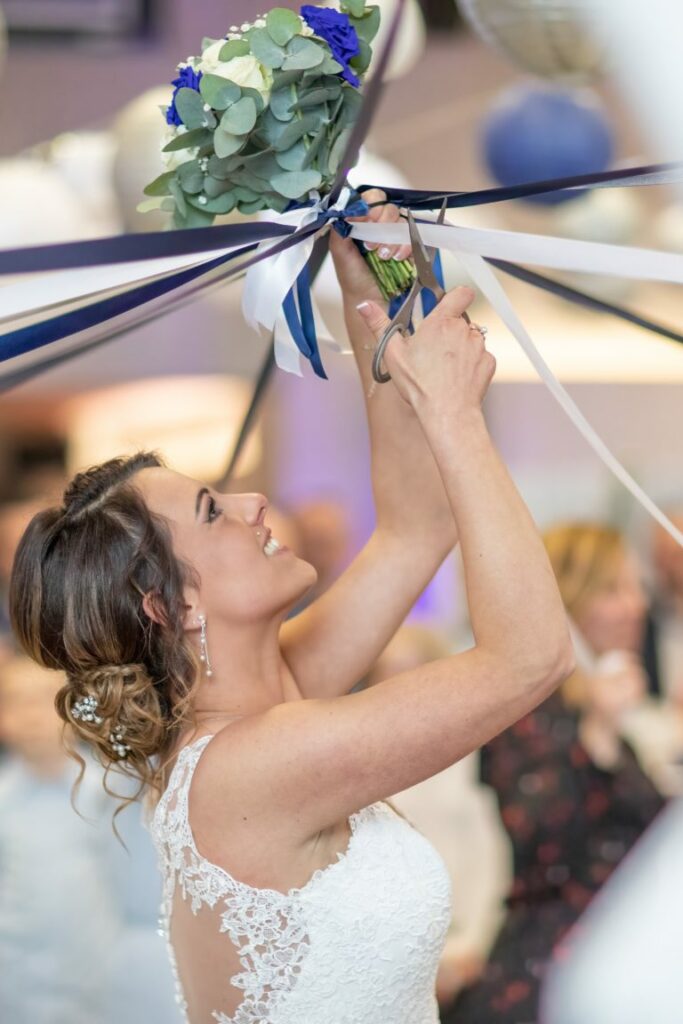 Encore une variante qui fera participer tout le monde. Autour des tiges de votre bouquet, attachez des rubans de couleur. Demandez ensuite aux participants d’attraper chacun un ruban, puis de le tendre. Ils se mettent ensuite à tourner pour éviter la triche. A l’aide d’une jolie paire de ciseaux, la ou le marié (e) viendra couper les rubans un à un, jusqu’à ce qu’il n’en reste plus qu’un ! Messieurs, n’hésitez pas à créer votre propre jeu des rubans en prenant une bouteille à la place du bouquet par exemple !