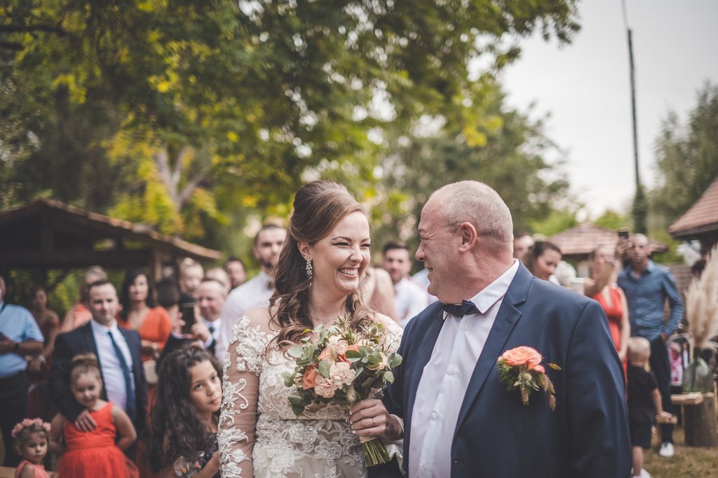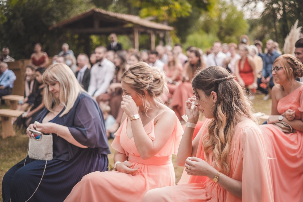 En grande fan de Béyoncé, la mariée avait choisi « Halo » pour leur cortège de cérémonie, et c’était MA-GIQUE ! Une musique jolie, puissante et révélatrice de leurs sentiments l’un pour l’autre. François a ouvert le cortège, accompagné par sa maman. Puis il a attendu sa douce, devant l’arche, le cœur battant. Les demoiselles et les garçons d’honneur ont suivi, dans un camaïeu de terracotta. Vint enfin la belle mariée et sa robe somptueuse, au bras de son papa, très ému. Cette entrée à la cérémonie nous donne le ton !