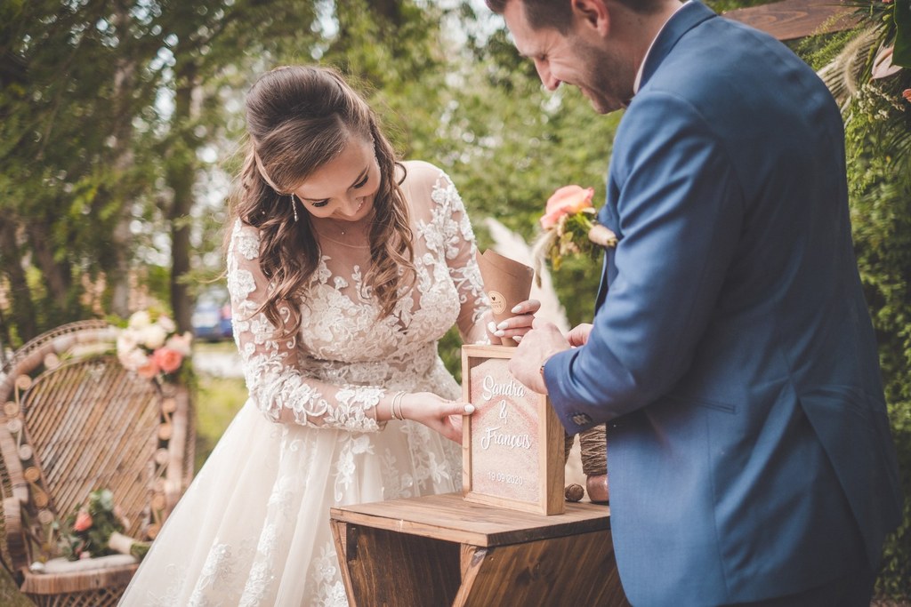 Pour marquer l’image de ce lien indestructible, Sandra et François ont souhaité réaliser le rituel du sable, dans un cadre customisé à leurs deux prénoms. Le choix des objets dans lesquels nous réalisons les rituels ont toute leur importance !