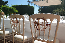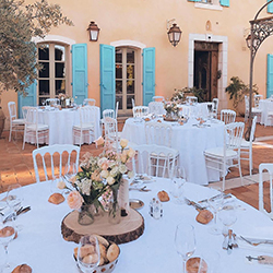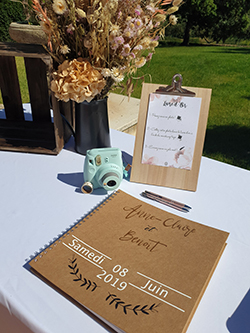 Elle s’est faite en deux temps: la veille et le jour J. La veille du mariage, nous avons installé toute la décoration en intérieur: le Photobooth, la pièce des enfants, le grand salon. Puis le jour J, toute la partie réception, qui se déroulait sur la terrasse du château. Anne-Claire et Benoît avaient choisi une décoration romantique. En centre de table, il y avait des rondins de bois, et de petits vases de fleurs roses et blanches. Mais en réalité le lieu se suffisait à lui-même et ne nécessitait pas beaucoup de déco pour être sublimé.