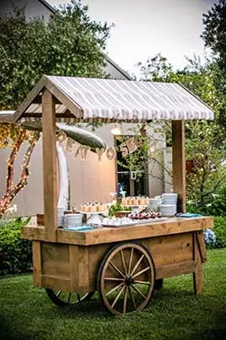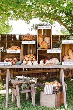 • Placez de grandes tables en bois pour votre buffet de vin d’honneur. Vous pourrez aussi ajouter des étagères ou des commodes pour présenter les mets et créer des perspectives à votre buffet. Pensez également au candy bar ou bar à boisson qui sont devenus des éléments de décoration incontournables !