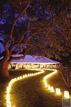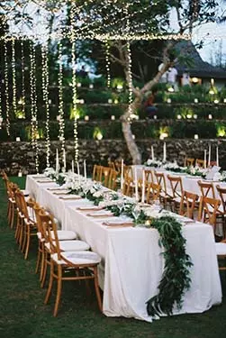 De plus, vous pouvez aussi utiliser des bougies et des chandelles pour donner un côté plus chaleureux et intime. Pour embellir l’endroit, éclairez la nature en faisant briller les arbres à l’aide de guirlandes lumineuses. En effet, pour réaliser un mariage en extérieur, les lumières doivent être bien visibles afin de donner un effet de mouvement de la nature. Celles-ci valoriseront les troncs des arbres et les plantes !