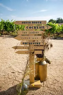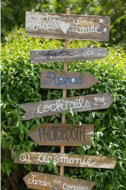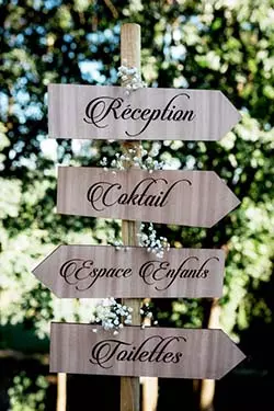 Vous souhaitez éviter les questions du genre : « Où se trouvent les toilettes ? », nous avons la solution ! Pensez à un panneau directionnel pour cette journée ! Il sera très utile et pratique pour diriger les invités surtout si votre réception de mariage se trouve dans un immense parc. Guidez-les donc à l’aide de flèches vers les endroits indispensables de votre mariage : vin d’honneur, cocktail, soirée, coin photos… Enfin, choisissez un panneau directionnel qui vous ressemble ! Pensez à le personnaliser en utilisant des matériaux spéciaux, des formes, des couleurs, des textes… Quoi qu’il en soit, ce panneau doit être en harmonie avec votre thème de mariage.