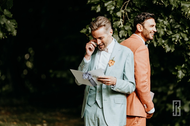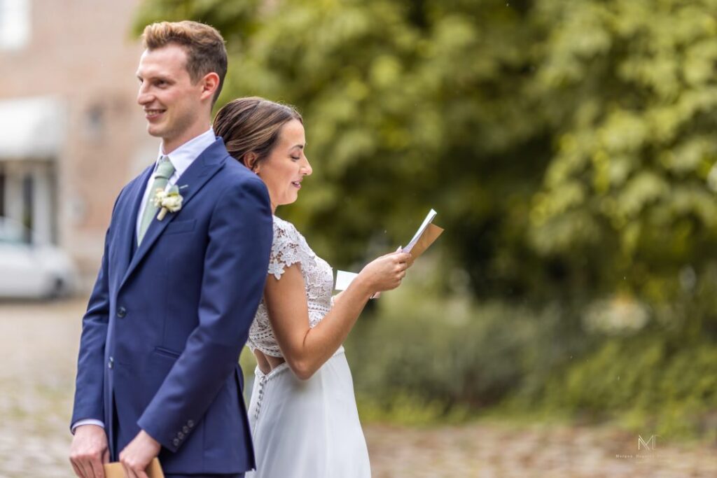 Vous pouvez aussi choisir de lire vos vœux avant de vous découvrir lors du first look. Dos à dos, vous vous lisez mutuellement vos déclarations, souhaits, votre amour, puis vous vous découvrez pour la première fois de la journée dans vos tenues de mariage. Entre joie et larmes, généralement c’est difficile de choisir !