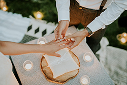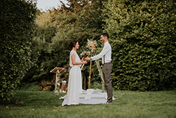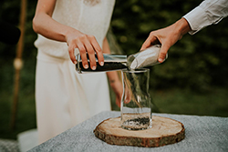 L’arche en tipi est ornée de fleurs et de végétaux, imaginés et façonnés par Les Fleurs de Marion, où l’on retrouve la chaleur des tons orangés et les branches de saule pleureur qui nous rappelle le début de journée. Le marié remet le doux bouquet à sa belle et ils s’échangent alors un profond regard, c’est le moment. Ils remontent alors l’allée de tapis, dessinée par les bougies, pieds nus, pour rejoindre leur officiante, Aurélie de Love & Life Events. Après un moment d’échanges, d’émotions fortes et de beaucoup d’amour, ils symbolisent leur union par un rituel du sable aux tons naturels. Chacun verse son sable, l’un blanc, l’autre gris, pour se rassembler dans un seul et même vase, symbole de leur union devenue alors indivisible. C’est un message fort qu’ils s’envoient l’un à l’autre.