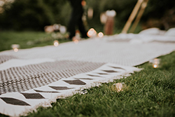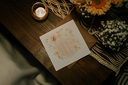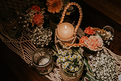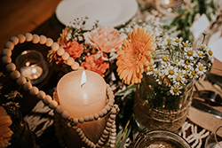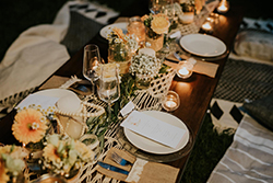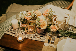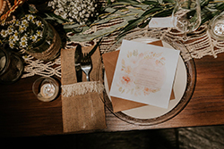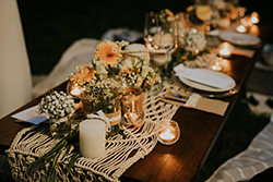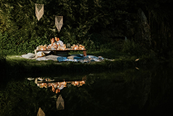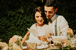Ils s’installent alors pour fêter leur union, près du lac, autour de cette table éclairée à la bougie et par la lune. Les tapis et coussins sur lesquels ils sont installés leur rappellent que ce mariage leur ressemble : il est fait de simplicité et de beaucoup de naturel. Un coup d’œil au menu imaginé et dessiné par Les Mot Inspirants, ils passent alors un agréable moment autour de cette jolie table soigneusement décorée par Les Fleurs de Marion et Love & Confetti. Un chemin de table en macramé donne de la texture à cette table en bois brûlé. Les petits pots de verre, décorés de dentelle et de perles sont embellis par la gaieté des germinis, des roses et du gypsophile. On les aperçoit au loin, leur reflet dans l’eau, partageant un moment intense et riche de complicité.