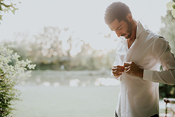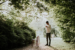 Et tandis qu’on commence à lui assembler sa coiffure, nous nous tournons vers le futur marié qui se prépare alors à l’abri des regards, dans un coin de nature. On lit alors dans son regard des sentiments entremêlés, c’est un moment intense, il sent en lui beaucoup d’émotion, ainsi que l’envie folle de voir sa belle arriver vers lui. Quelques boutons enfilés, le nœud papillon ajusté, et les bretelles remontées, il la retrouve alors.