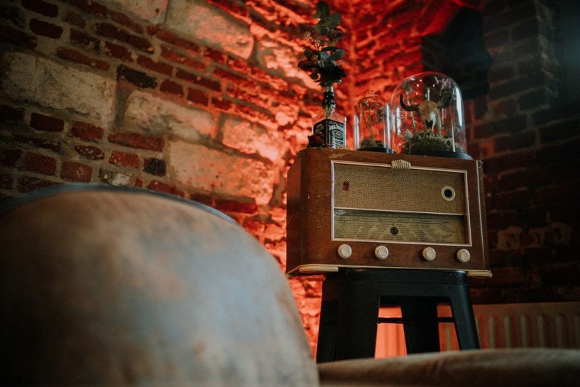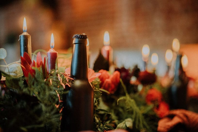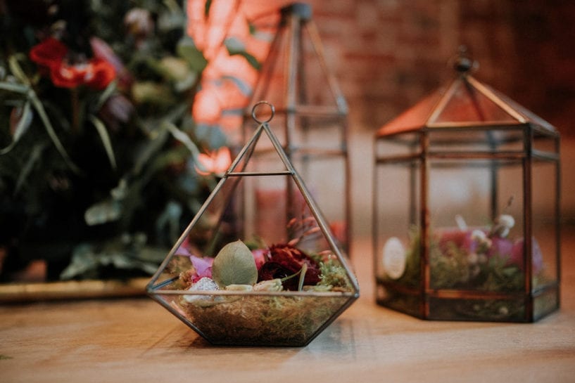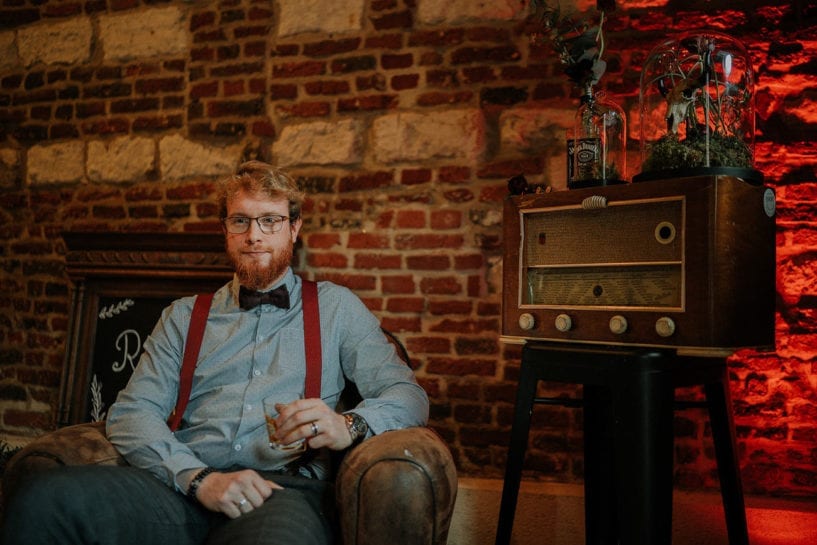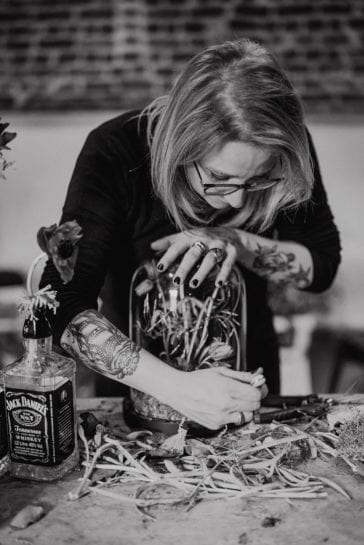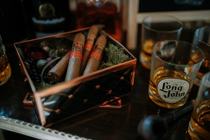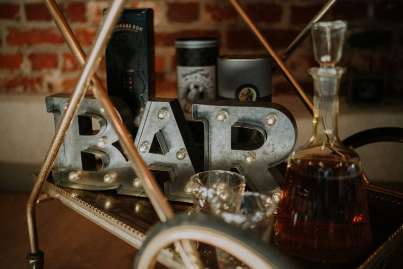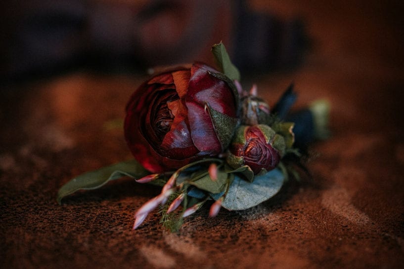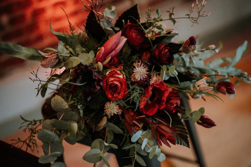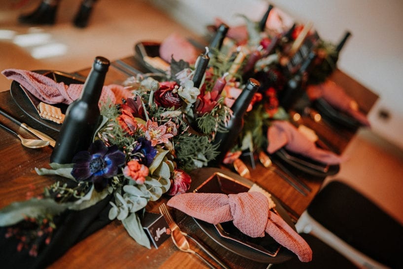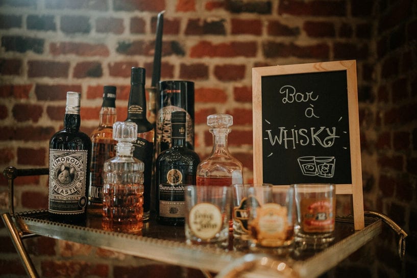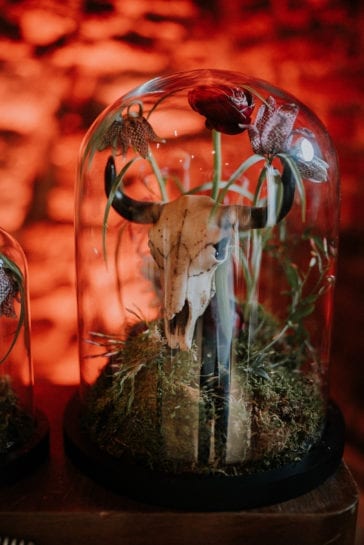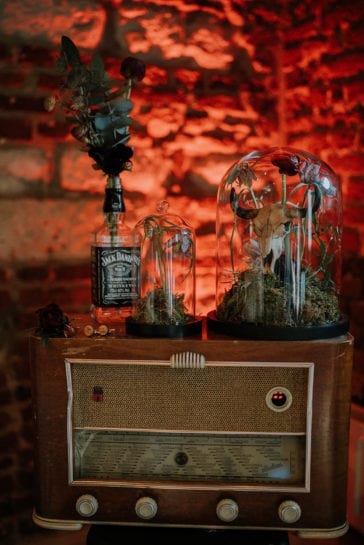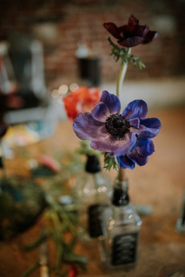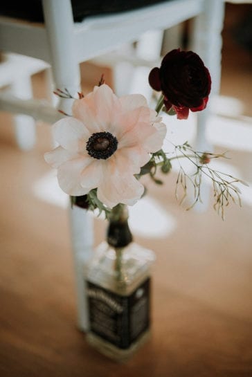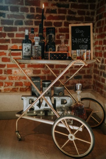 Une vieille charrette en métal en guise de bar à whisky et cigares. Un vieux guéridon qui a traversé les âges ornés de têtes de buffles. Des bouteilles de Jack Daniel’s réutilisées en guise de vase. Et évidemment, des fleurs. Des anémones violines, des roses grenats, des tulipes marsalas, et quelques touches d’orangers et de bleus.