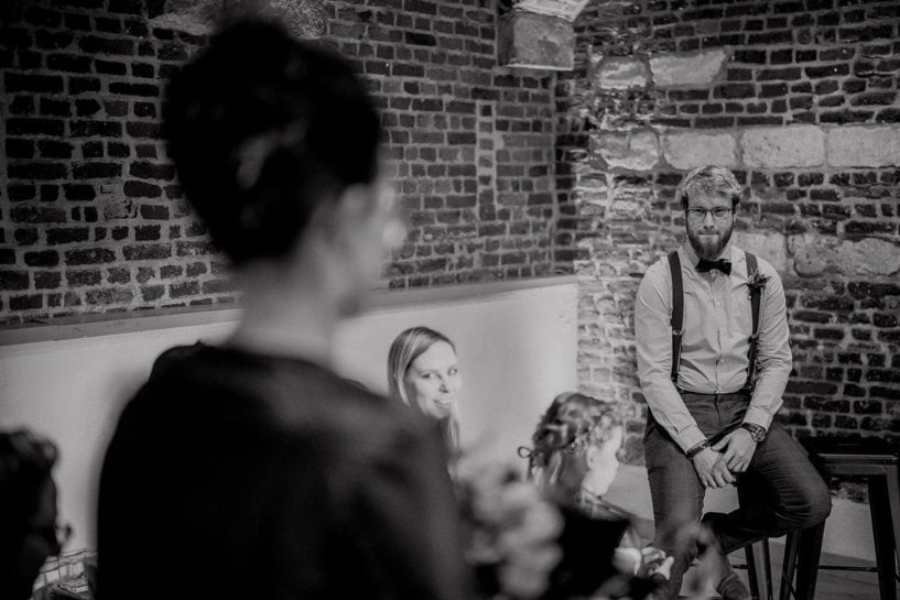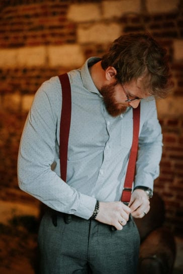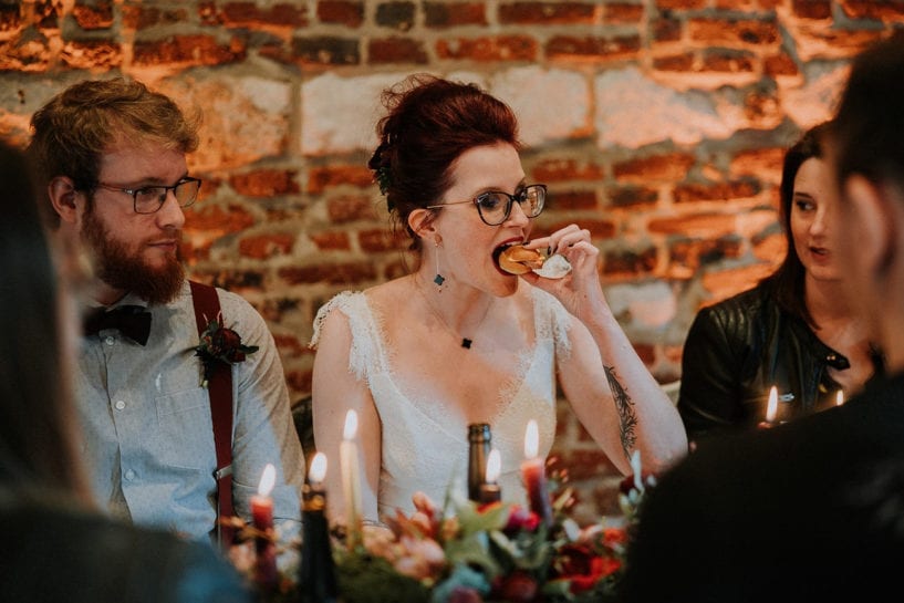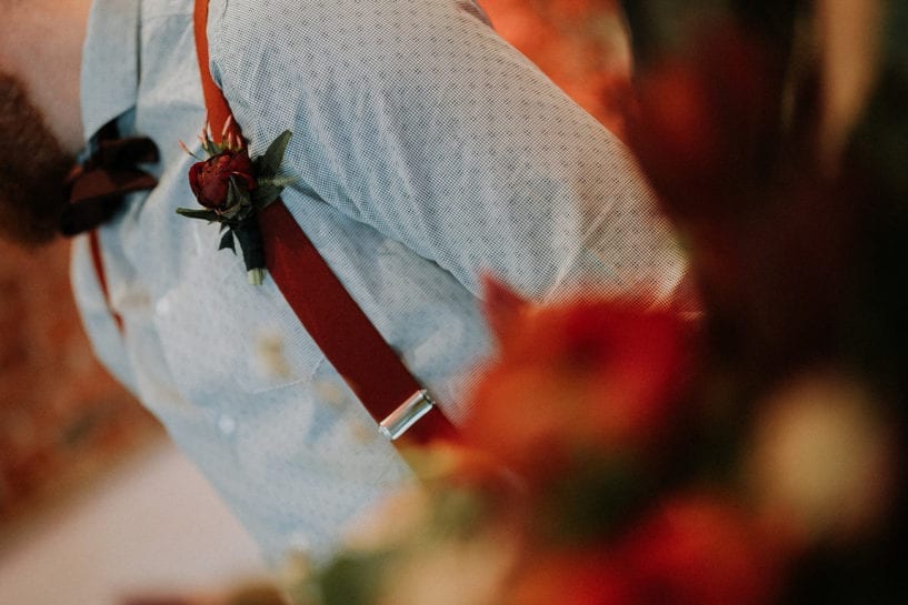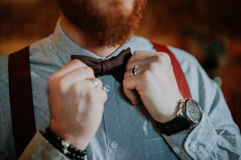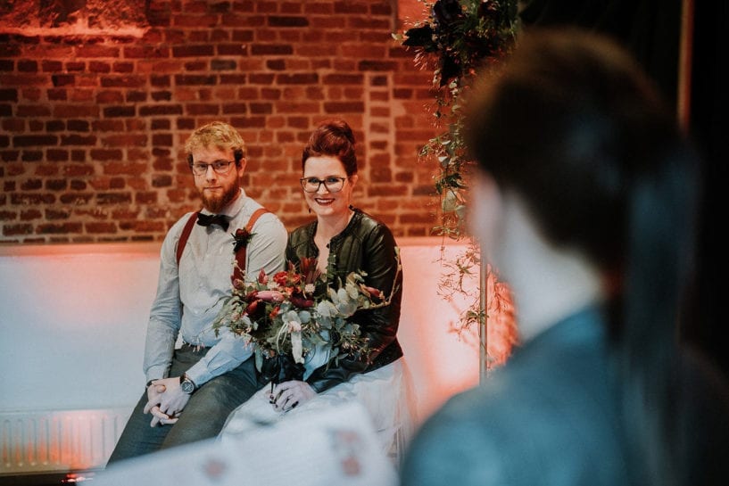 La cérémonie débute par l’arrivée des demoiselles d’honneur: jupe tulle, bottines à clous et blouson de cuir of course ! Ca c’est rock ! Et ça annonce bien la suite. Le marié fait son entrée, lui a pensé aux petits détails: boutons de manchettes en mode hipster et accessoires marsala. La barbe sauvage.