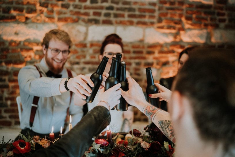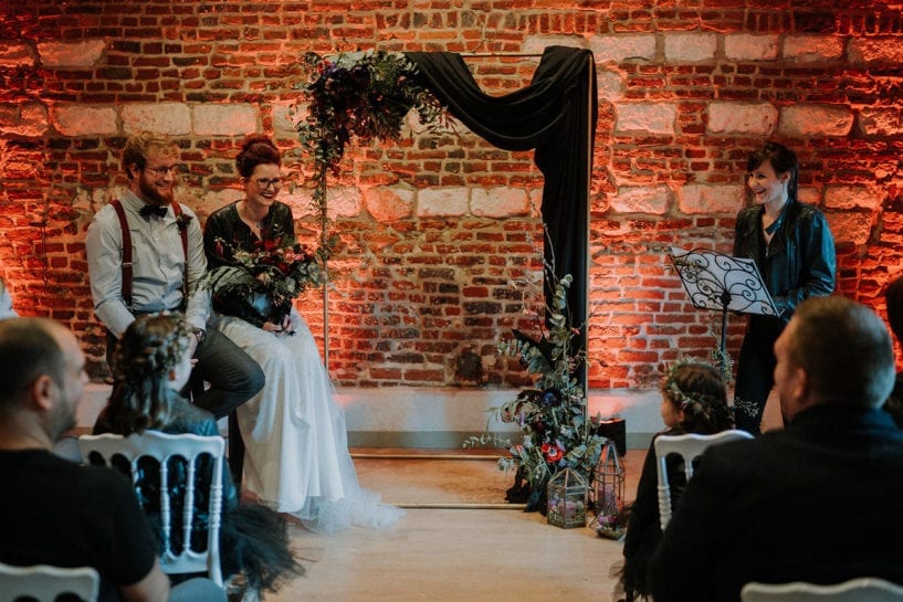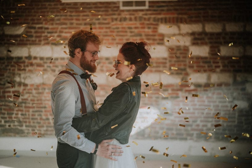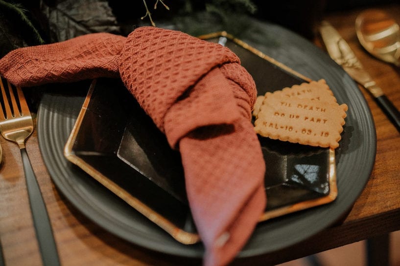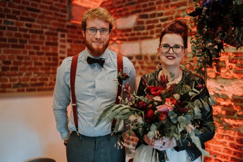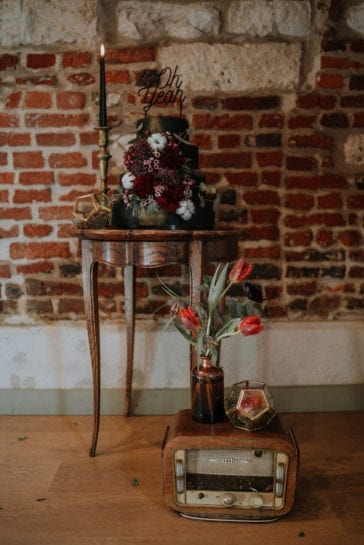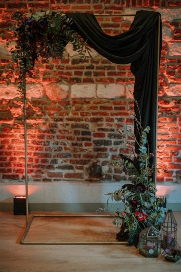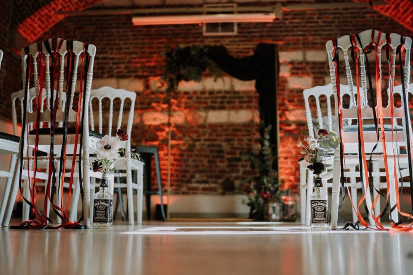 C’est au Clos de la Source, à Hem, près de Lille, que nous avons organisé notre inspiration mariage Rock’N’Love. La brique de la salle de la voûte apportait le caractère essentiel à ce shooting. On avait envie de créer une ambiance bien brute, un mariage où on sortirait des sentiers battus et où on laisserait apparaître le côté décontracté mais néanmoins singulier de ce thème. Quand on pense ROCK, on pense aux matières et aux matériaux, on pense aux couleurs dark, et on pense à une poésie forte et spontanée.