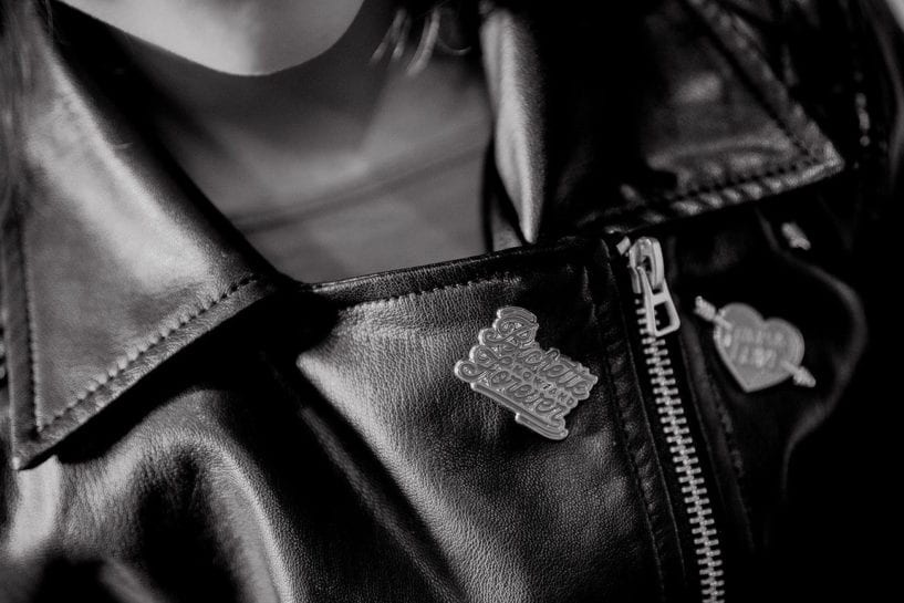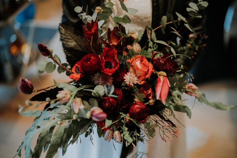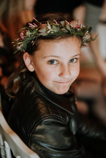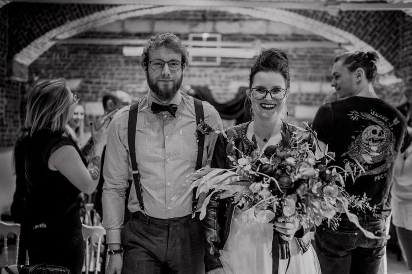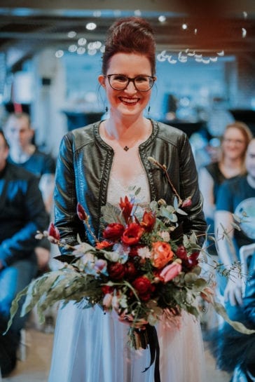 Puis la mariée arrive. Evidemment, elle revêt un blouson de cuir pour contrebalancer avec la douceur de sa robe blanche. Elle tient à la main un magnifique bouquet destructuré qui vient parfaire l’ensemble de sa tenue, et fait un clin d’oeil à son attache de coiffure.