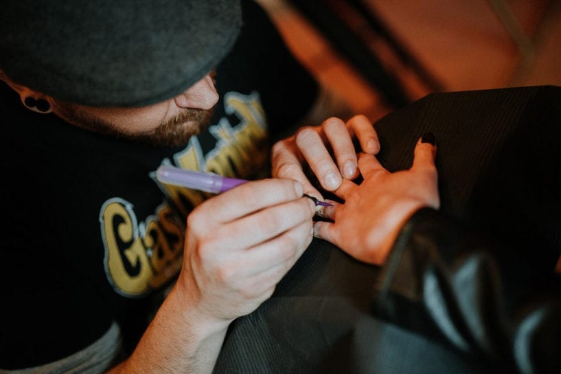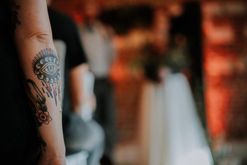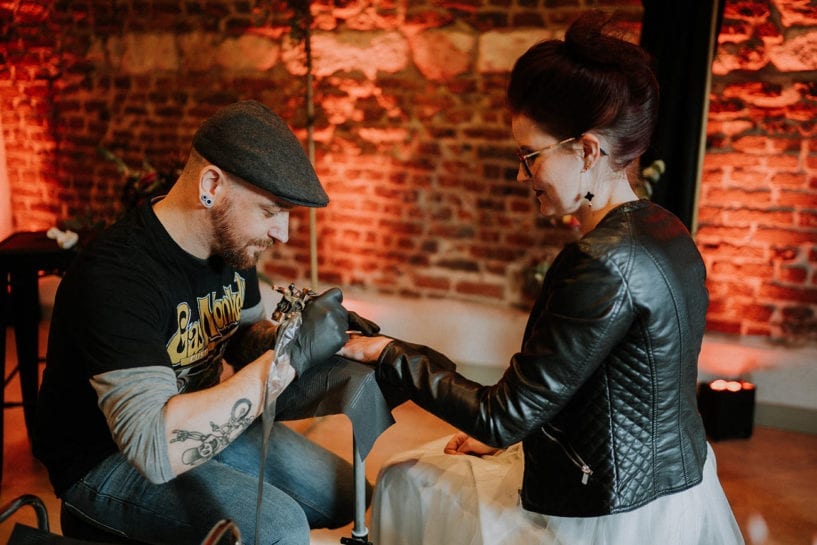 Ils se rejoignent, s’embrassent et s’installent. On démarre la cérémonie. On y raconte l’histoire des mariés, les motivations qui les engagent l’un envers l’autre ce jour. Afin de balayer leurs craintes pour les années à venir, les mariés brûlent leurs peurs, en guise de rituel de cérémonie. Ils échangent leurs voeux, puis leurs alliances… à moins que … non ! Ils se tatouent leurs alliances ! Plus éternels que les anneaux traditionnels, les tatouages qu’ils auront encrés en eux les suivront pour toujours. De l’audace jusqu’aux plus petits détails !