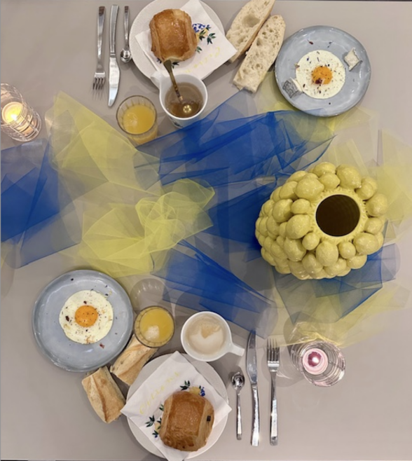- Pour les noces de tulle, on a organisé un brunch décoré de tulles jaunes et bleus.