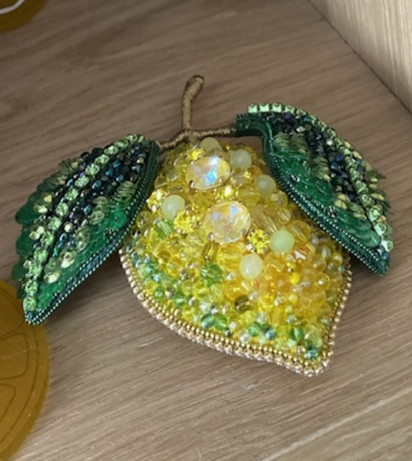 - « Pour les noces de strass, on s’est acheté une broche citron en strass et paillettes.