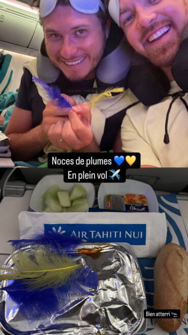 - Pour les noces de plumes c’était le retour de notre voyage de noces de Polynésie française, j’ai demandé à Dim de fermer les yeux et j’avais pris des plumes bleues et jaunes pour mettre sur son repas en plein vol.