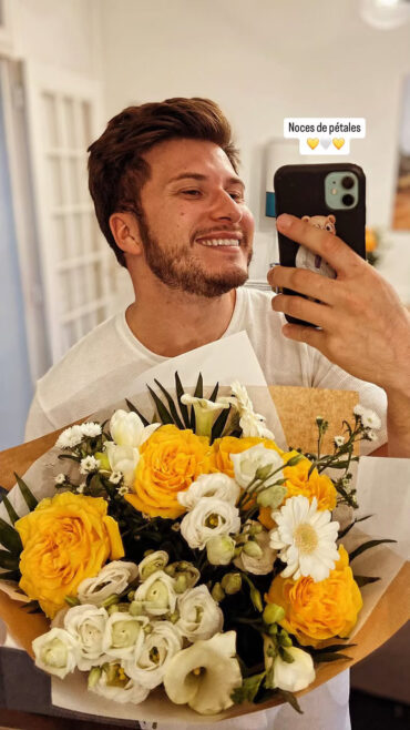 Dimitri : « Je suis allé chez le fleuriste acheter un bouquet et il s’avère qu’il n’y avait plus de fleurs jaunes. J’ai vu sur leur comptoir un bouquet avec plein de roses jaunes et il s’avère que Jé avait appelé le matin même pour en réserver. J’ai réussi à faire un bouquet avec des couleurs similaires. »