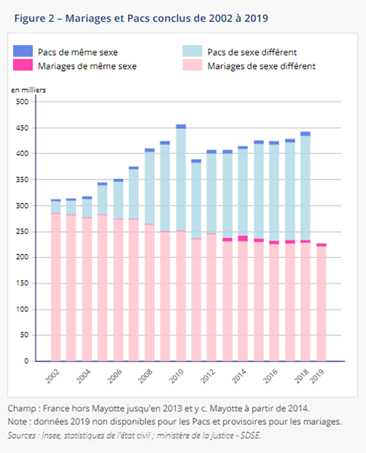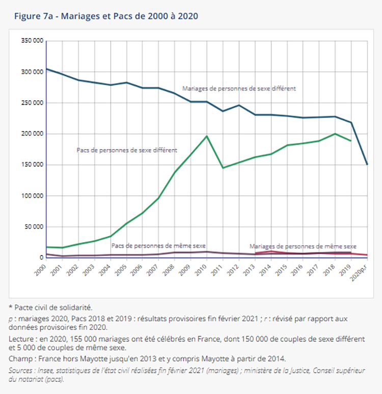 Beaucoup de mariages sont célébrés chaque année en France. Selon les données publiées par l’INSEE 227 000 couples se sont dit “oui” en 2019. L’année 2020 a plutôt vu ce chiffre à la baisse. Entre la situation sanitaire et les restrictions mises en vigueur, il a été très difficile de se marier. De la limitation du nombre d’invités, en passant par le couvre feu puis l’interdiction des pistes de danse, beaucoup de futurs mariés ont pris la décision de reporter leur mariage voire de l’annuler. Pour certains, l’option a été de se marier tout de même, mais, en petit comité. Selon l’INSEE, c’est 31% mariages de moins qu’en 2019. Seulement 155 000 mariages ont été célébrés en 2020.