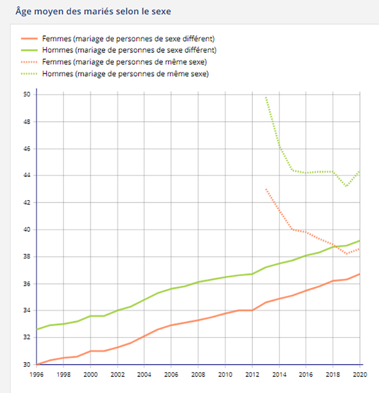 Les chiffres clés qui vont suivre vont peut-être vous surprendre ! L’âge moyen d’une femme qui se marie est de 36 ans ; et 39 ans pour un homme. De manière plus générale concernant les mariages de sexe différent, le couple est en moyenne âgé entre 30 et 34 ans. Quant aux mariages de personnes du même sexe en France, l’âge moyen des hommes qui se marient est de 44 ans ; et 38 ans pour les femmes.