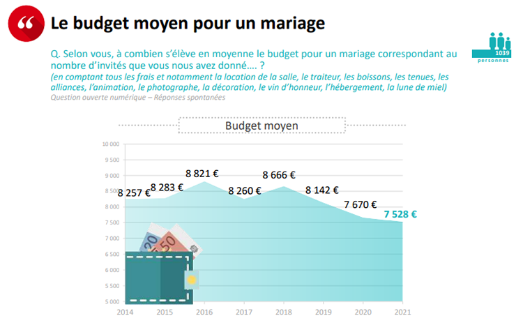 Vous vous demandez sûrement combien coûte un mariage en moyenne ? Nous avons trouvé les données d’un sondage réalisé par OpinionWay pour Sofinco sur le budget moyen consacré à un mariage. Il faut savoir que les tarifs d’un mariage varient en fonction des éléments que vous choisissez : Wedding planner, photographe, vidéaste, fleuriste, DJ, officiant de cérémonie, lieu de réception, traiteur, … et j’en passe ! En partant sur un mariage de 50 convives en 2021, le budget consacré en moyenne par foyer est de 7 528€. Cette moyenne représente un budget équivalent à 15 000€ pour une base de 100 invités.