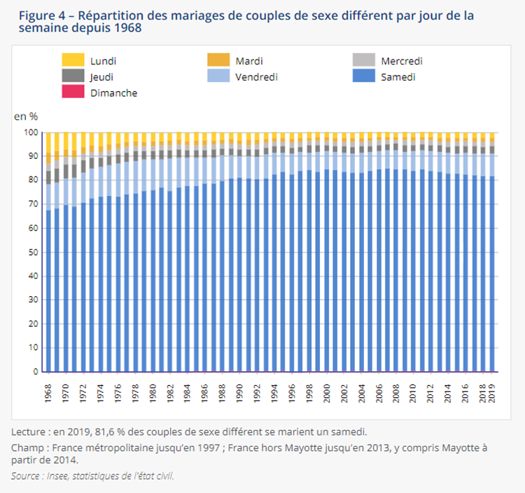 En 2019, 82% des mariages ont eu lieu un samedi. Ce jour le plus emprunté pour les mariages permet aux futurs époux de faire la fête jusqu’au petit matin. Et même de pouvoir prolonger le bonheur partagé avec les proches le lendemain lors d’un brunch. On constate toutefois de plus en plus de mariages qui se déroulent le vendredi. Mais c’est encore timide comparé au samedi. Ce graphique est flagrant :