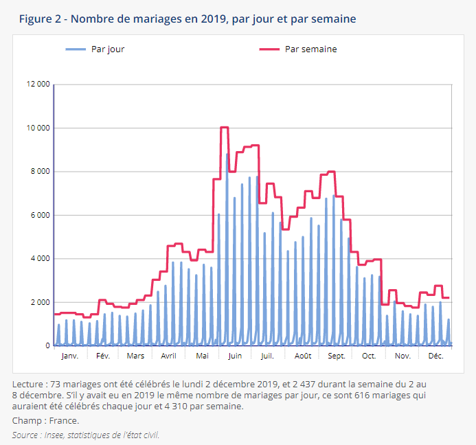 Selon les données publiées par l’INSEE, la majorité des mariages ont lieu sur la haute saison. En effet, sur les 227 000 mariages célébrés en 2019 :
