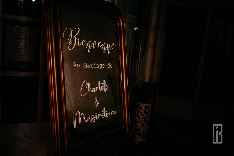 Nous avons joué avec le côté baroque du lieu en ajoutant des miroirs vintages sur les points de déco stratégiques: panneau de bienvenue, plan de table, menu…