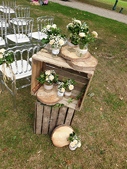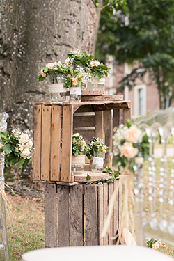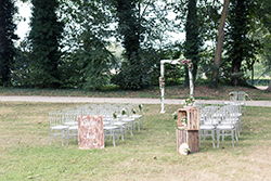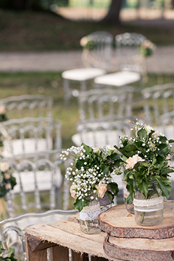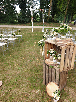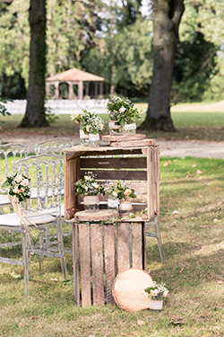 Les mariés avaient choisi des chaises Napoléon transparentes, fleuries des petites compositions blanches et orangées que leur fleuriste avait préparées. L’arche en bois se faisait en rappel des caisses bois, et rondins qui décoraient l’entrée de cérémonie. Enfin, ils avaient choisi un panneau de « Bienvenue » en bois personnalisé avec leur prénoms.