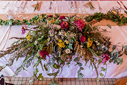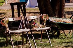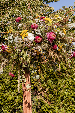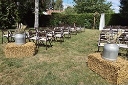 - Ballots de paille pour les décorations d’entrée de cérémonie, avec de gros pots à lait et des compositions de fleurs des champs