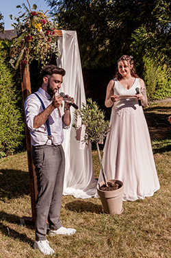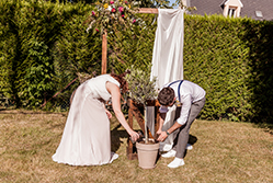 Valentine et Mathieu ont ensuite réalisé le rituel de l’arbre. Durant ce rituel, le couple replante un arbre, choisi avec soin pour sa symbolique, dans un plus grand pot. Il donne une nouvelle dimension, un nouvel avenir à cet arbre. Cet olivier, on peut l’assimiler à leur couple. Il est déjà bien enraciné, il a déjà un solide tronc, de vigoureuses feuilles. Et cet arbre, il va grandir, s’étoffer, se renforcer… comme leur relation. il marque le jour du mariage, et grandira au fil des années que ces deux amoureux parcourront.