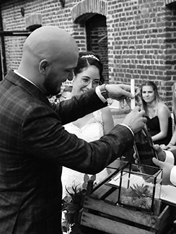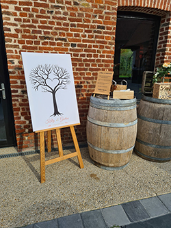 Une fois les mariés unis par la cérémonie laïque, les proches ont été invités à se désaltérer au vin d’honneur. Entre deux discussions, quelques retrouvailles et une distanciation sociale maitrisée, les convives pouvaient venir « encrer » dans le temps leurs empreintes, sur le grand tableau réalisé par Fanny, de Les Mots Inspirants. Un magnifique souvenir que les mariés garderont de cette journée, et de leurs invités !