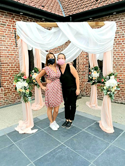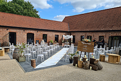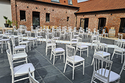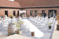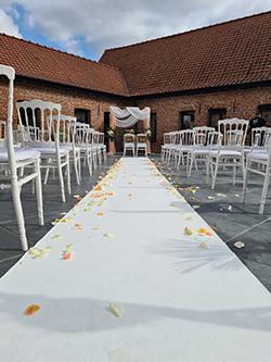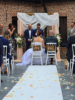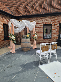 Le jour J, à la première heure, je me suis rendue à la Ferme Saint Chrysole. C’est parti ! Le soleil nous a fait l’honneur de sa présence, on a donc installé la cérémonie laïque en extérieur, dans la cour de la ferme. Kelly et Gaëtan ont choisi une arche rectangulaire en bois, drapée de mousseline pêche et blanche. Marion, de Les Fleurs de Marion, avait prévu quelques compositions pour venir sublimer le tout. Pour le pupitre, un vieux tonneau vintage ferait l’affaire. Puis nous avons installé les chaises Napoléon blanches. En ce temps de crise sanitaire, nous avons adapté l’espace cérémonie pour garantir la sécurité de chaque invité.