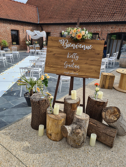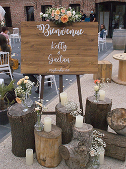 Pour les accueillir, Kelly et Gaëtan avaient envie d’un joli panneau de bienvenue en bois, avec une ambiance chaleureuse et fleurie.