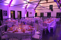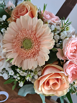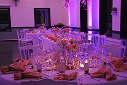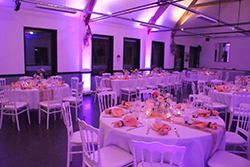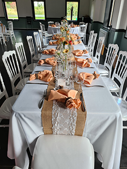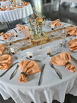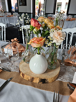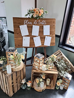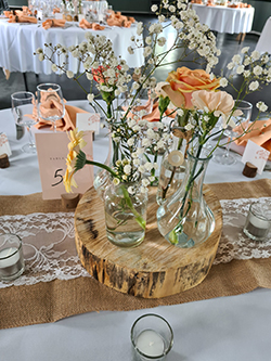 Puis en entrant dans la salle, on commence à y découvrir les détails de la décoration de mariage. Le plan de table indique à chacun la table qu’il rejoindra bientôt. Chaque table est traversée d’un chemin en jute et dentelle qui apporte ce fameux côté champêtre. Au centre, on trouve un rondin de bois, qui accueille quelques soliflores et bougies. Lisianthus, gypsophile et roses viennent égayer les tables, et leurs couleurs aux tons orangers apportent aux invités de la chaleur.