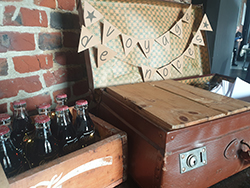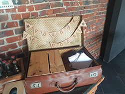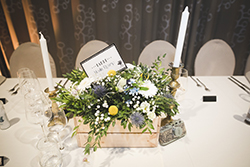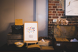 Côté table « cadeaux », une vieille valise (de chez Eventweek) en guise d’urne pour le voyage de noces. On y trouvait également un arbre à empreinte, revisité sur le thème de « Là-haut ».