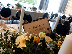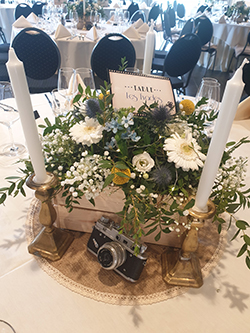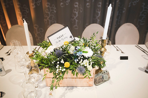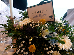 C’est Fanny de Les Mots Inspirants qui a imaginé et réalisé la papeterie de table. Les noms de tables faisaient référence aux films préférés des mariés, tels des bobines de film. Moulin rouge, Mission impossible, Jumanji, etc… Pour les marques places, on était plutôt parti sur des tickets de cinéma, et le plan de table ? le programme des films à l’affiche de cette soirée.