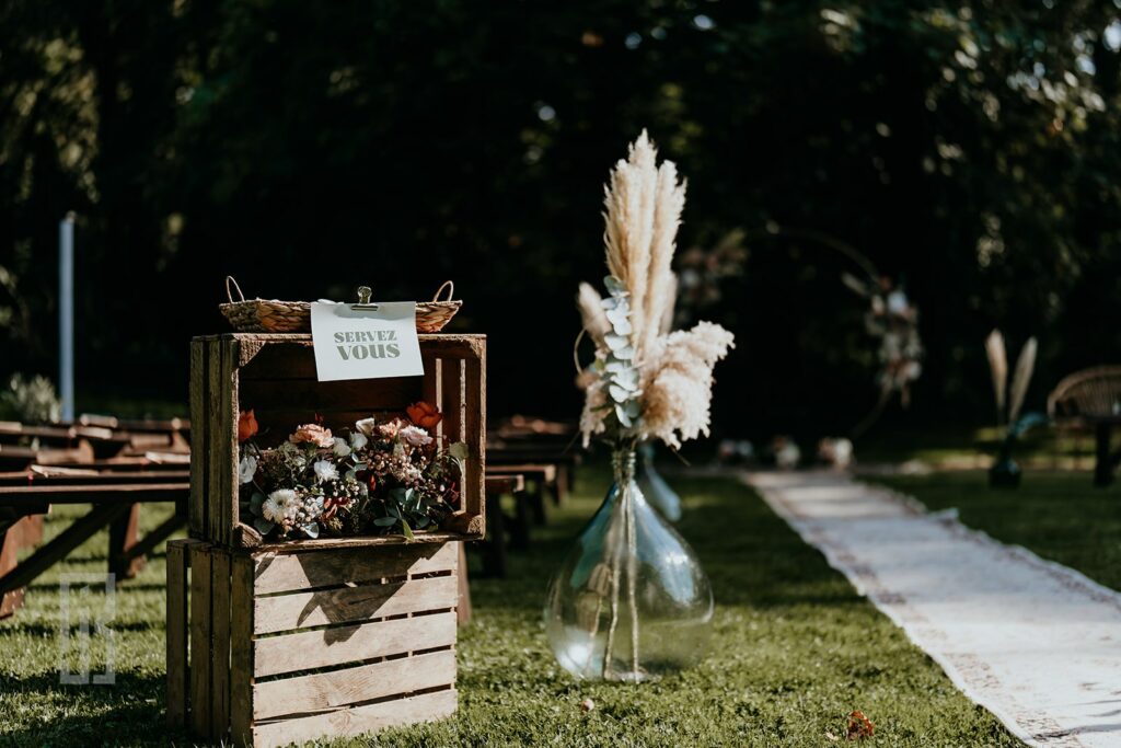 Une fois la cérémonie laïque terminée, c’est l’heure d’aller trinquer en l’honneur de nos mariés ! L’équipe traiteur de l’Amphitryon était prête pour régaler les convives pendant que nous attaquions notre troisième partie déco : l’art du replacement. On prend tout ce que l’on peut dans la cérémonie pour replacer chaque chose au vin d’honneur ou bien dans la salle principale pour en profiter un maximum. Ce sont souvent les fleurs que l’on replace, car en effet c’est un budget alors autant en profiter !