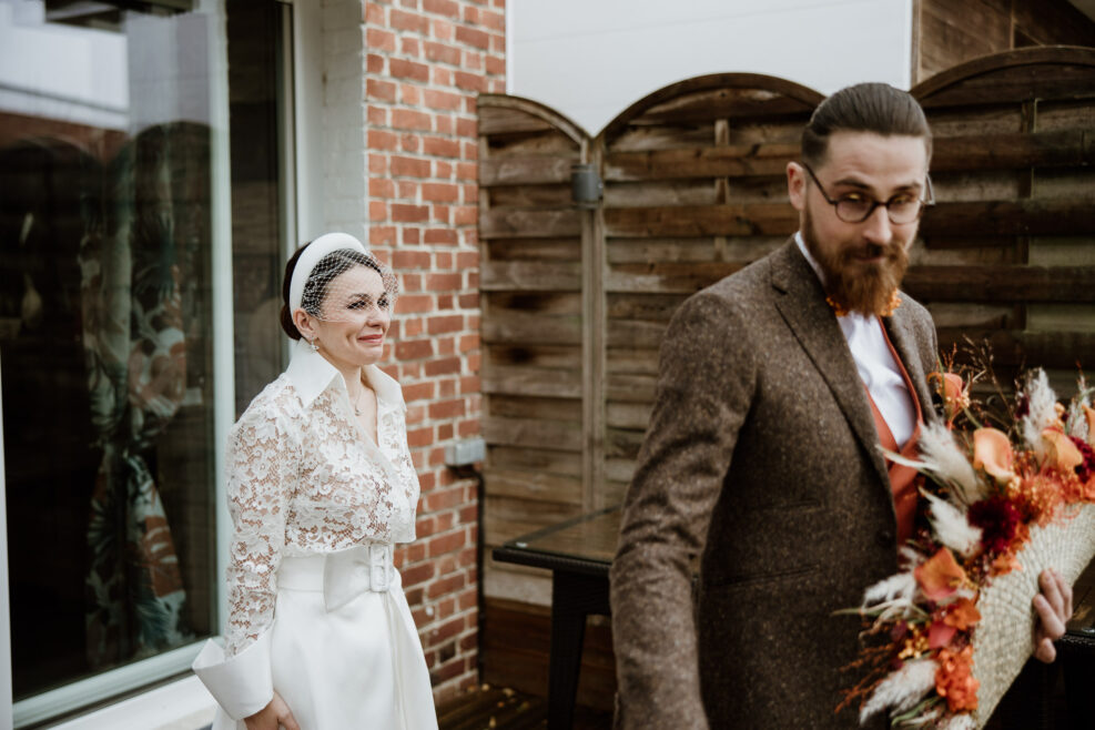 Lors de cette jolie matinée, pleine de surprise pour Anaïs qui découvre peu à peu les jolis cadeaux de son futur mari, c’est à Thomas de découvrir sa belle. Et c’est chez les parents d’Anaïs que le first look s’est déroulé. Une fois le bouquet en éventail (super original au passage !) remis à la mariée direction la mairie pour se dire oui !