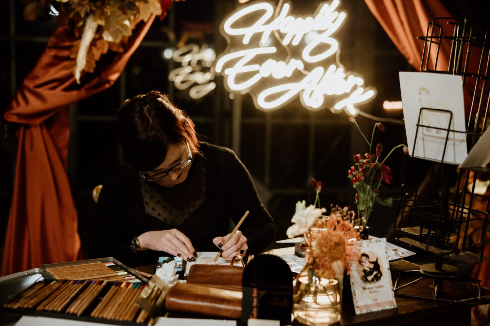 Et pour animer toute cette splendide décoration nos mariés ont choisi le livre d’or audio de chez Laissez-nous un message ainsi que les magnifiques dessins en aquarelle de Morgane. Les invités sont repartis avec des portraits d’eux réalisés durant la soirée, si ça ce n’est pas un super souvenir !