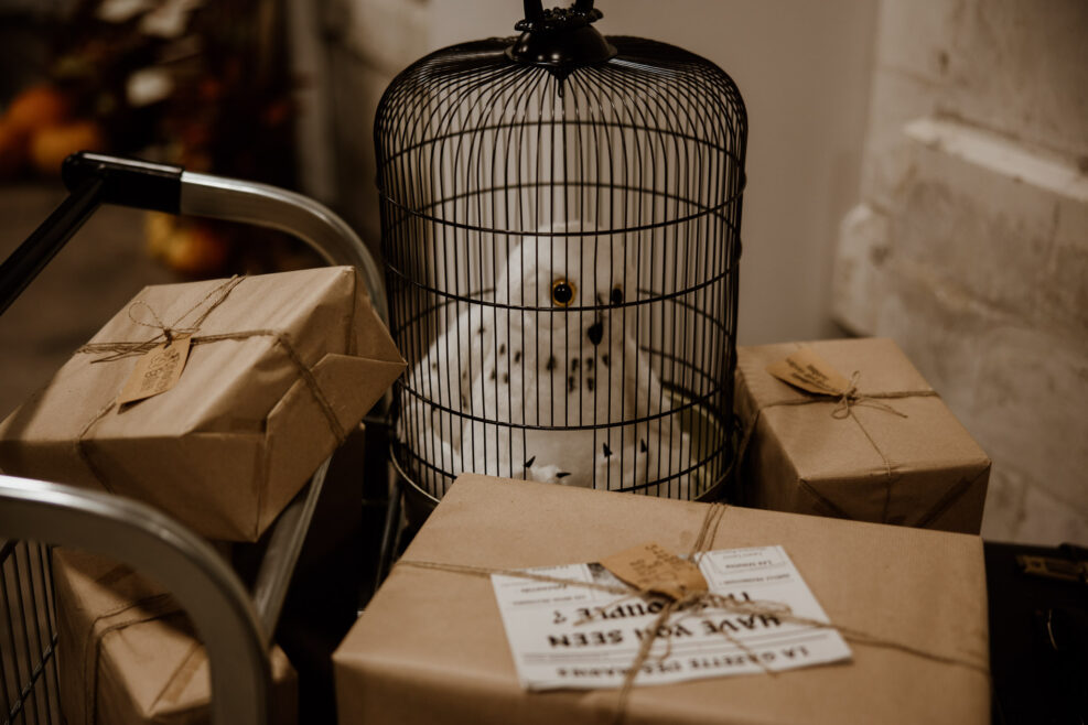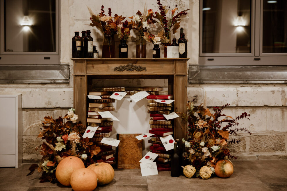 À chaque rendez-vous, une nouvelle idée de la part de mes mariés ! C’était assez impressionnant je l’avoue ! Nous avons (presque) réalisé toutes leurs envies dans une ambiance chaleureuse et cocooning avec quelques détails Harry Potter. Et ce n’était pas si sorcier que ça ! Une livraison de citrouilles par la grand-mère d’Anaïs qui a démarché tout son village. Ou bien, un chariot plein de valises avec la cage d’Hedwig, des potions et plein de lettres dans une jolie cheminée, le tour était joué !