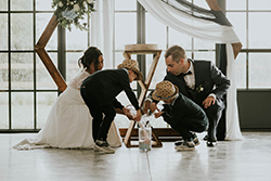 Pour symboliser leur union, mais aussi leur famille, on fait le rituel du sable, avec les enfants. Chacun est représenté par une couleur de sable. Ce sable, symbolise ce qu’ils sont en temps qu’individu, leur passé, leur présent, leurs qualités et leurs défauts. Ensemble, ils mélangent leurs sables dans un plus grand contenant. Les sables se mélangent en couches. On distingue le rose, le bleu, le vert … Il est désormais impossible de les séparer. Ce rituel représente alors cette volonté de s’unir, à jamais. Mais tout en gardant les spécificités et personnalités de chacun, qui gardent « leur couleur ». On s’engage à être toujours là les uns pour les autres, mais tout en restant soi-même.