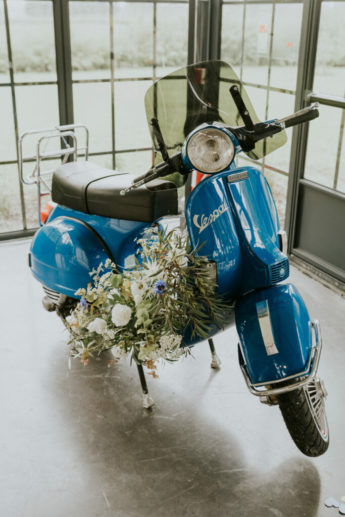 Les mariés souhaitaient également ajouter une touche de bleu en faisant venir un Vespa tout droit d’Italie (ou presque) !