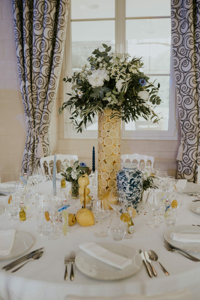Au niveau des centres de tables, la fleuriste a coupé de nombreuses rondelles de citrons pour en garnir de grands vases sur lesquels elle a par la suite pu déposer une composition florale.