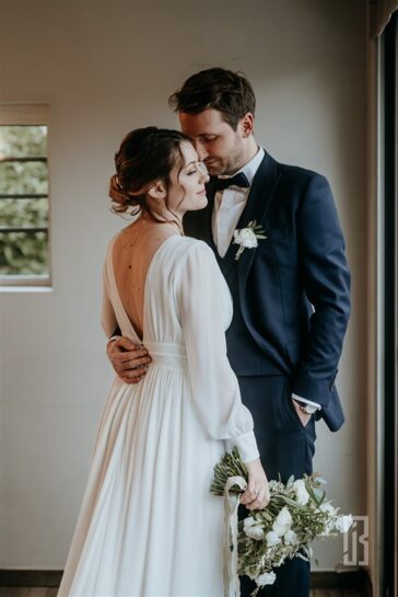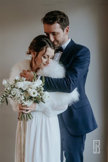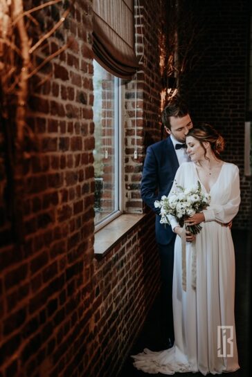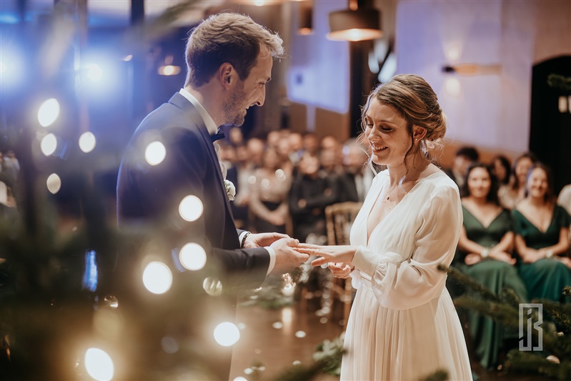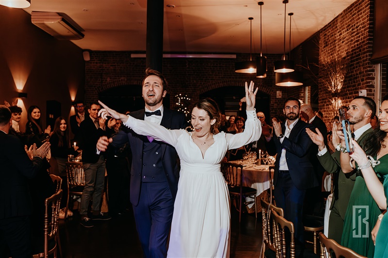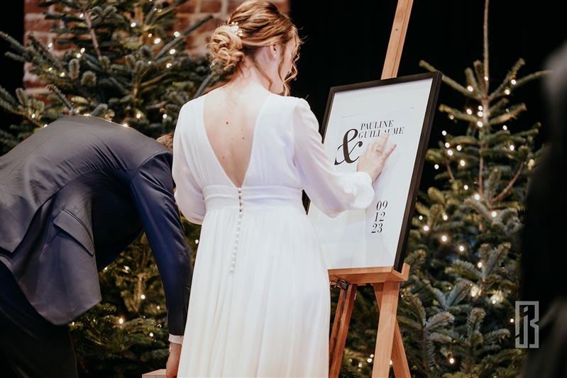 Ce projet de mariage, Pauline et Guillaume me l’ont confié 6 mois avant. A l’heure où ‘on doit s’y prendre plutôt 1 an et demi voir 2 ans avant, ils viennent avec ce beau challenge ! Relevé évidemment ! En 6 mois à peine, on réfléchit, on choisit, on acte. On se livre, on s’écoute, on partage. On les conseille, on les guide. Et nous voilà le 9 décembre à l’Amphitryon de Roncq, près de Lille, dans le Nord. On installe le samedi matin toute la décoration de mariage, bien aidées de Atelier Rozo, notre fleuriste, et de l’équipe du domaine. Puis tout s’enchaîne: le first look, l’accueil des invités, la cérémonie, le vin d’honneur puis la réception.