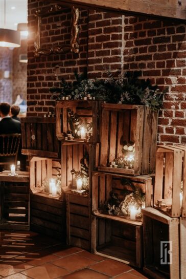 Les mariés souhaitaient une décoration sur ce thème, oui, mais sans en faire trop, que ça reste sobre et chic. Exit les couleurs rouges et vertes, nous sommes plutôt partis sur la lumière. 200 bougies. 200 BOUGIES ! C’est ce qu’on a installé dans la déco. Dans l’entrée, dans l’allée de cérémonie, sous les sapins en guise d’arche, sur les tables, les rebords de fenêtre … On en a mis partout. (Et imaginez bien qu’allumer 200 bougies, ça prend du temps ahah!)