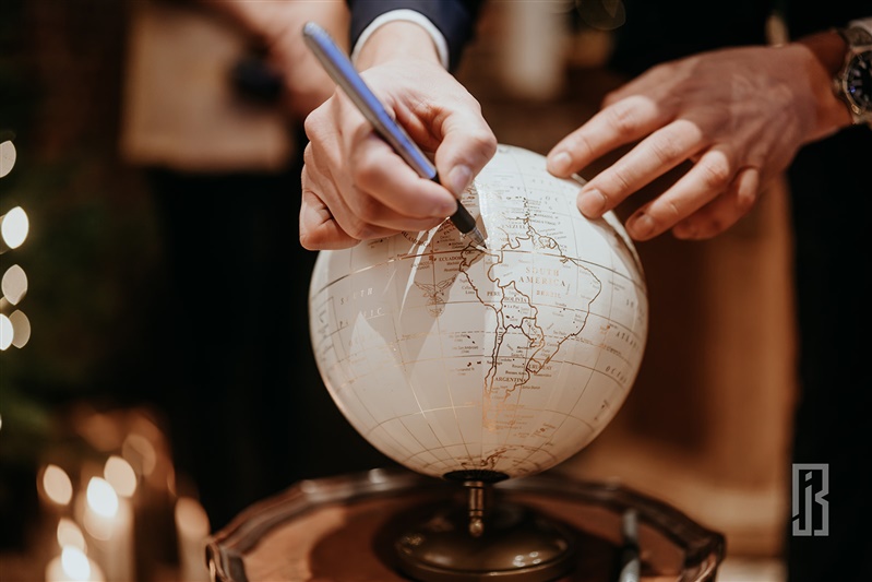 On ponctue ce moment hors du temps par des rituels. Ici, la petite nouveauté, c’est le rituel de cérémonie du « Tour du monde ». Quelques invités ont été choisi pour leur côté barroudeur, et sont venus entourer une destination sur le globe. Les mariés se sont engagés à réaliser ces voyages durant leurs prochaines 15 années de mariage !