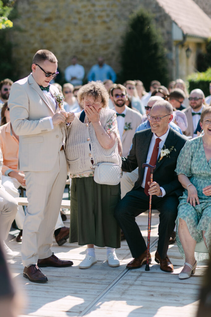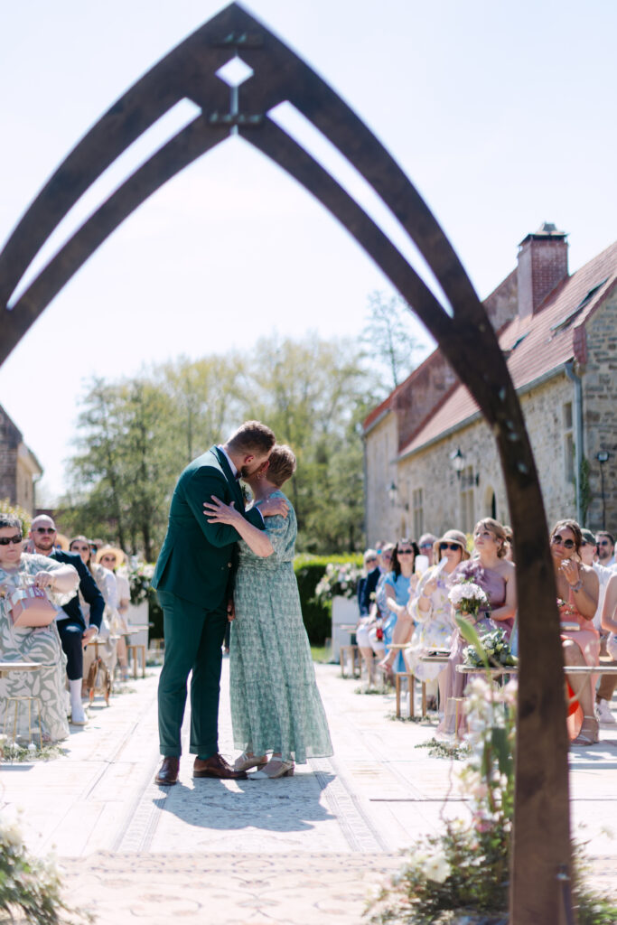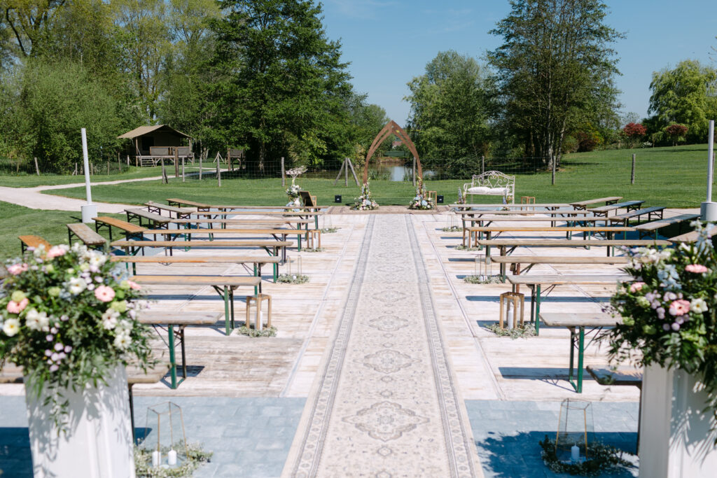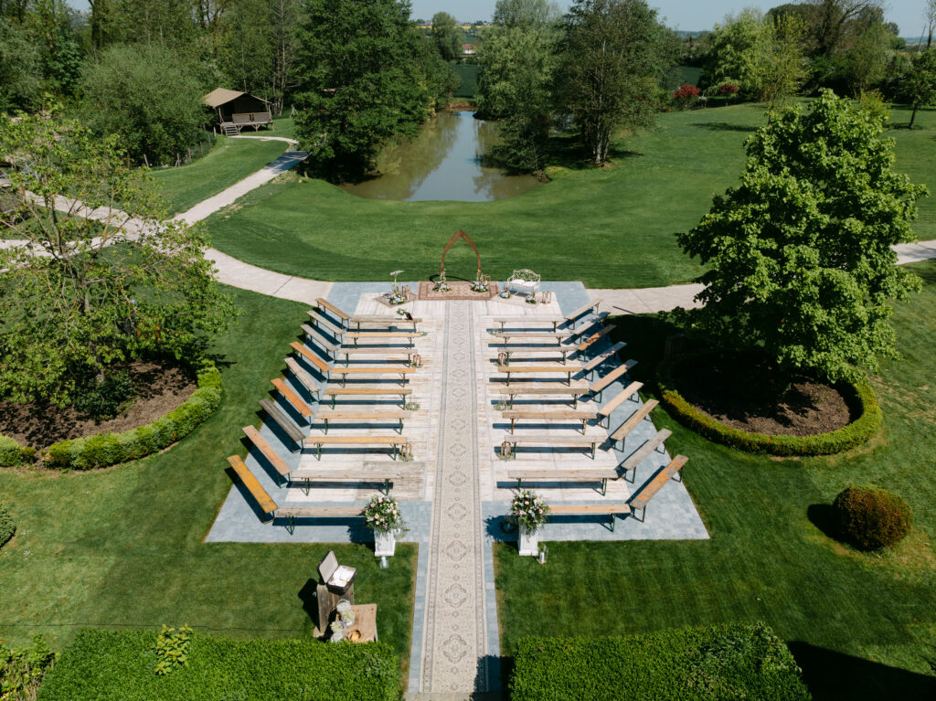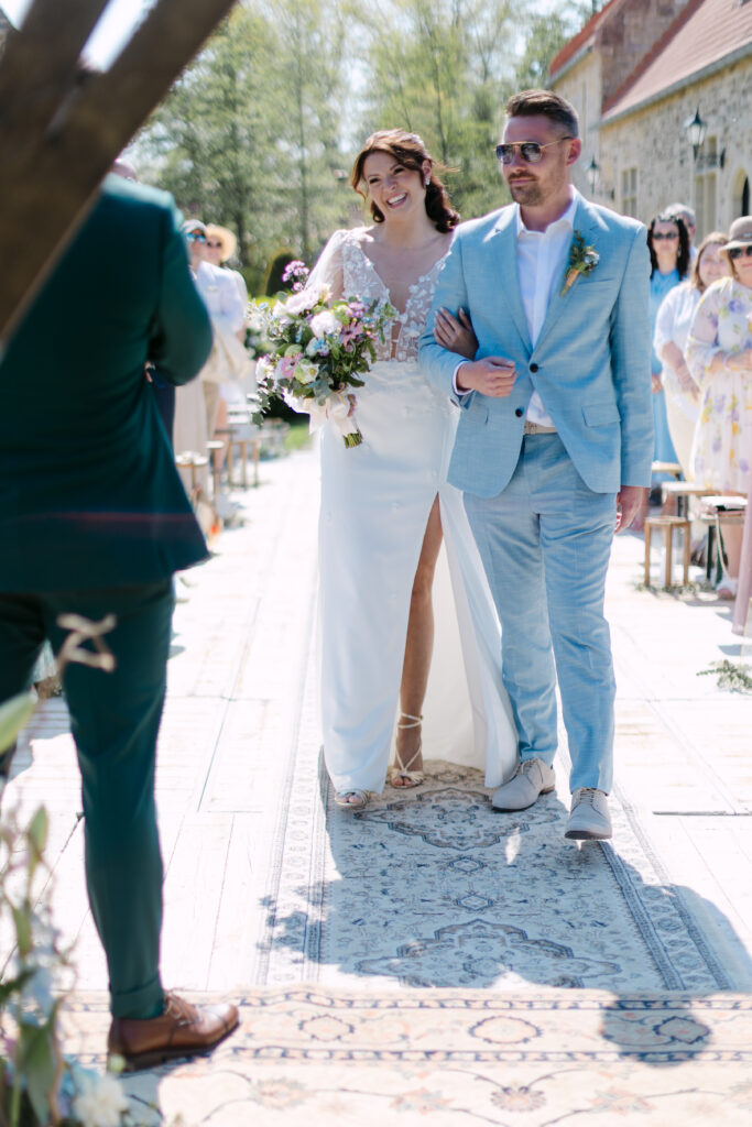 Le soleil était au rendez-vous, ce qui nous a permis de mettre en place la cérémonie laïque en extérieur dès la veille. Une vraie chance, car nous avons pu organiser une répétition générale avec tous les témoins, notamment pour coordonner l’arrivée du cortège. Une étape précieuse qui a permis à tout le monde d’être détendu et prêt pour le grand jour !