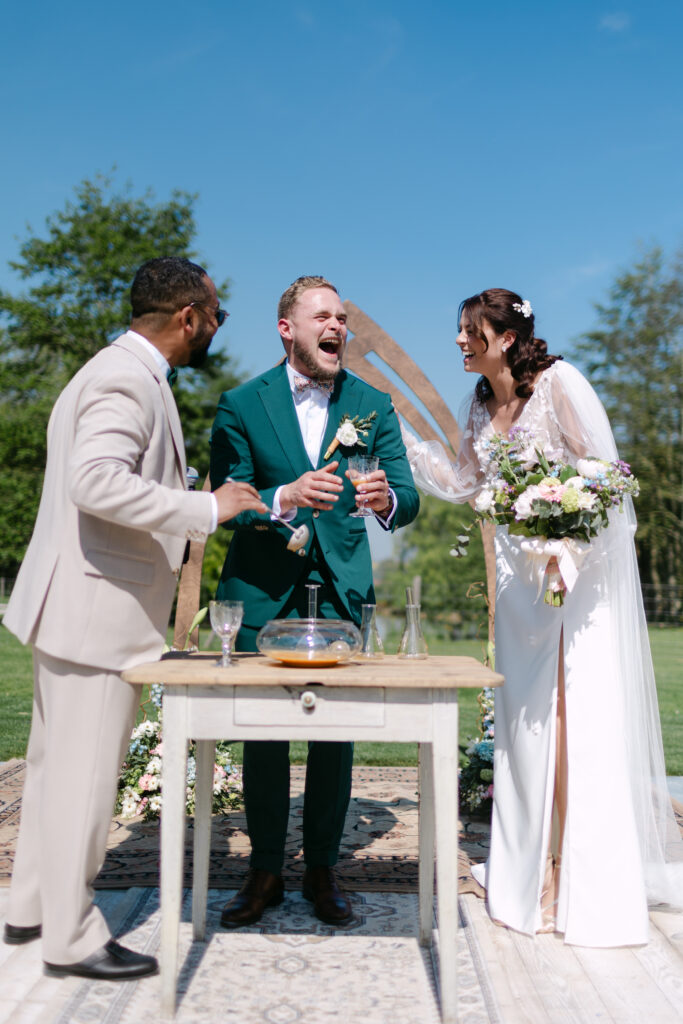 Pour cette cérémonie, j’ai eu le plaisir d’assurer un coaching cérémonie laïque pour Mehdi, le proche officiant choisi par les mariés. Grâce à la préparation en amont, il a su mener la cérémonie avec humour, bienveillance et émotion, un vrai moment de sincérité qui a touché tous les invités.