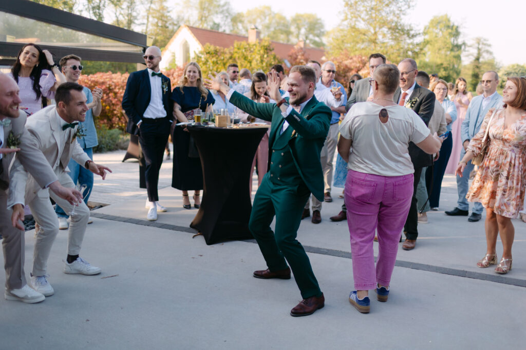 La soirée a ensuite continué dans une atmosphère chaleureuse et festive, fidèle à l’esprit des mariés. Et pour la touche d’humour : les mariés ont même apporté une énorme tête à l’effigie de leur chat sur la piste de danse, histoire qu’il soit symboliquement présent à la fête !