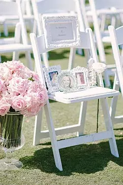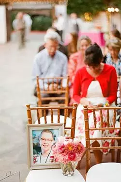 Vous pouvez également rendre hommage à vos proches sans nécessairement avoir à le dire avec des mots. Réservez-leur une place avec un accessoire qui vous fait penser à cette personne. Vous pouvez disposez sur une chaise une photo dans un jolie cadre ou indiquer son prénom sur une pancarte. Ecrivez une citation ou un extrait de paroles de chanson. Vous pouvez préférer mettre en avant quelque chose de plus personnel encore, en disposant un accessoire qui lui appartenait : un vêtement, un chapeau, un bijou, un objet, un morceau de tissu…