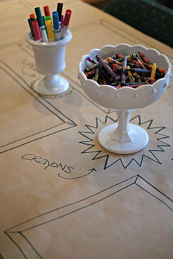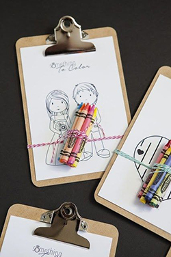 - Kits de coloriage, une pochette garnie de feutres, de crayons de couleurs avec des coloriages sur un thème spécifique ou non. Des sets de table à colorier ou des wedding book avec des jeux et dessins sur le thème du mariage